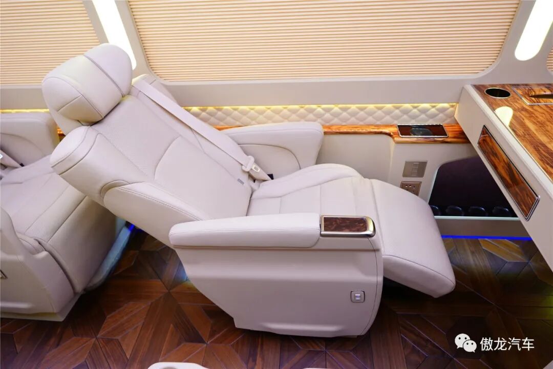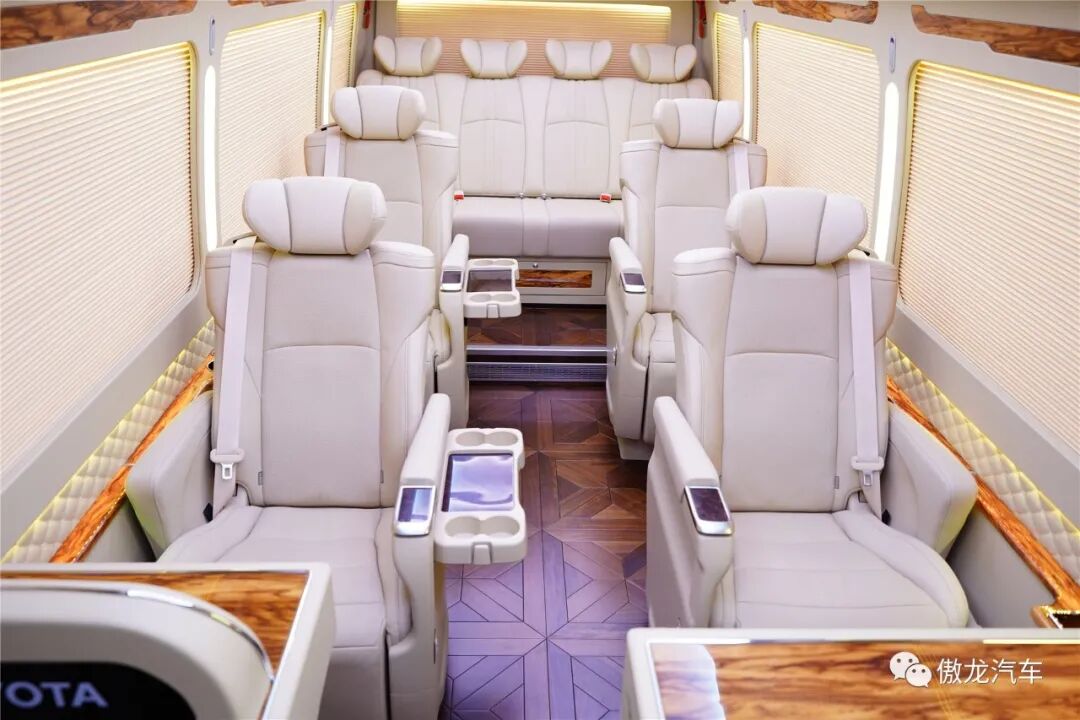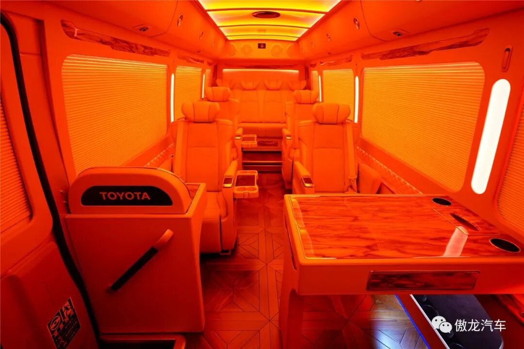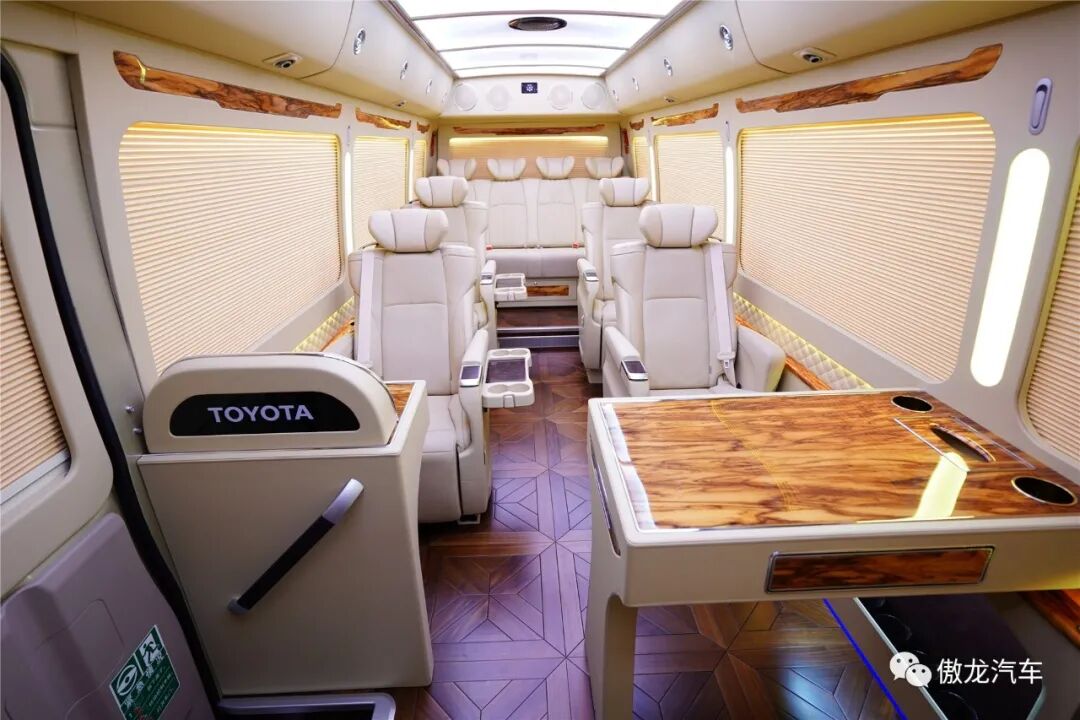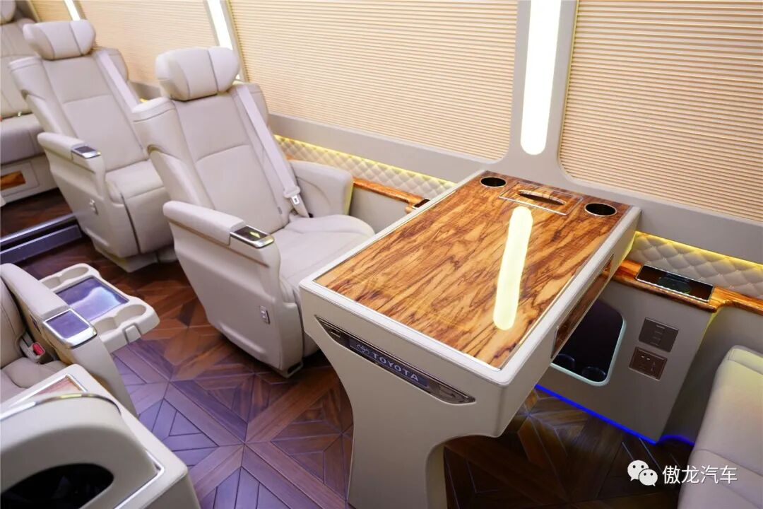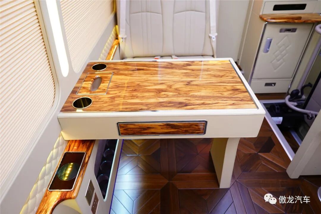 丰田考斯特12座尊享版车内铺设了深色梧桐木样式的游艇实木地板,桌面采用了当下最流行的龙血檀木设计,踏入车内将带给您如同观赏艺术品一般的视觉享受。